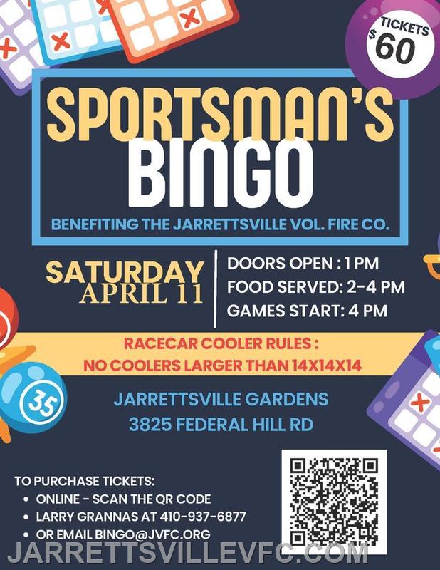 | Jarrettsville Volunteer Fire Company Sportsman's Bingo Saturday April 11th 2026 Tickets $60 per person includes meal/bingo (must have ticket to attend)